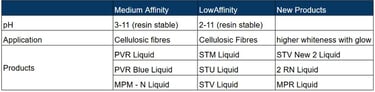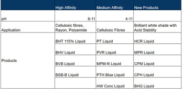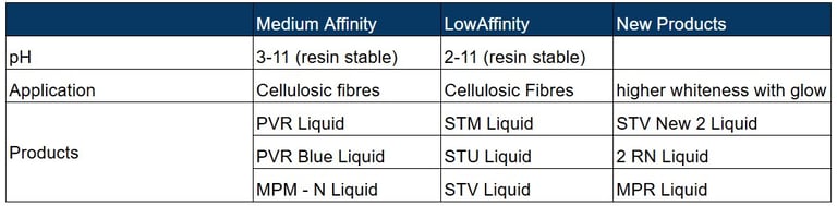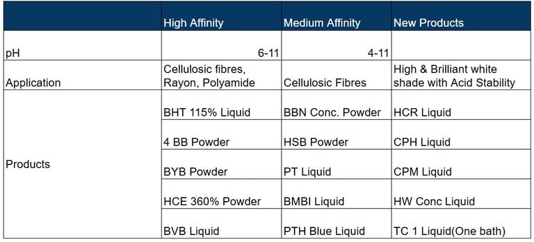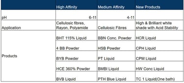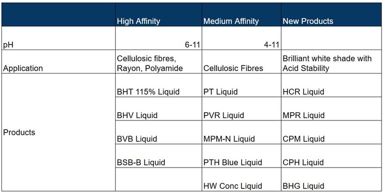 Robust OBAs for Cellulosic fibres used in pad dry and pad dry cure processed. Products are also available in tinted version
